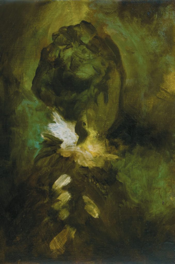 From all of the pieces viewed, I find these pieces to be the most sinister in a much different way from the others. The fact the artist has used a very delicate and ‘pretty’ palette, as well as a gentle and controlled application of the paint is rather contrary to the messages portrayed within the pieces. The woman in the first piece is ethereal, with us being able view through her torso as she faces away from us. The second of the child is rathwer disturbing. Whilst it is titled ‘Sleeper’, I cannot help but imagine what I do not want to even consider, that this beautiful, angelic child is actually just a corpse, which is extremely disturbing, but also really grasping. The third is utterly bizarre. The lady in the image is dressed in a very pretty manner and, again, could be viewed as angelic and innocent, but then her face – which is the thing which draws you in in the first place due to it being the only darkness in the piece (the opposite I think would also ring true, should the colours be inverted) – is very disturbing and unnerving to behold. I am taken, for some reason, to the wartime and feel as though this ‘angel’ could be watching over me during an air-raid perhaps. Whilst I said above that I prefer the darker, murkier works to produce the sinister, I cannot help but admire this method as the artist works in a delicate and pretty way, which generally does not appeal to me, but the results are very disturbing for the viewer, which then draws my interest and intrigue back in. Perhaps this is something I could consider going forward as well, instead of just shutting myself off to one method solely to create a darker atmosphere within my pieces? Perhaps dark doesn’t have to be so dark after all.