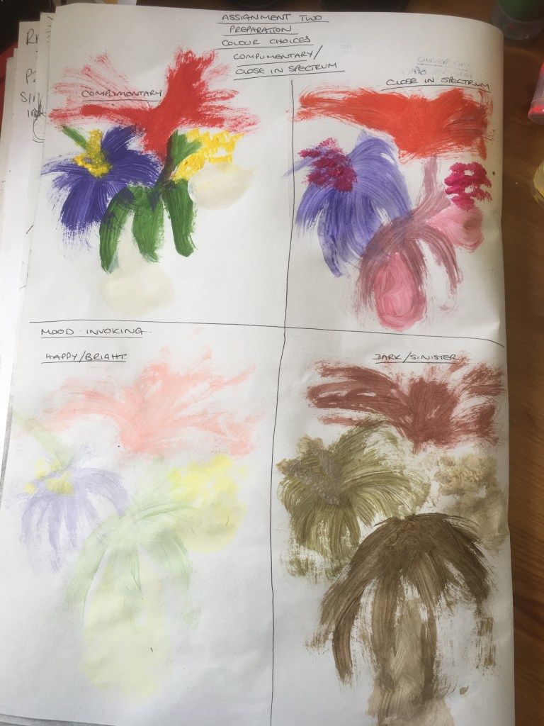 Looking at the four different colour choices and considering my tutor’s comments regarding attempting to work in earthy tones, I decided that I would work with the colours within the bottom right experiment. The colours in this experiment were created by mixing the complimentary colours closest to the original colours in my set-up to achieve their earthy colours to create a muted version. Depending on the original colour, I mixed the two complimentaries in different ways. If, for example, the flower was purple, I allowed for more purple and less yellow in the mixture to keep it as close as possible, but to bring in that duller, muddier tone.