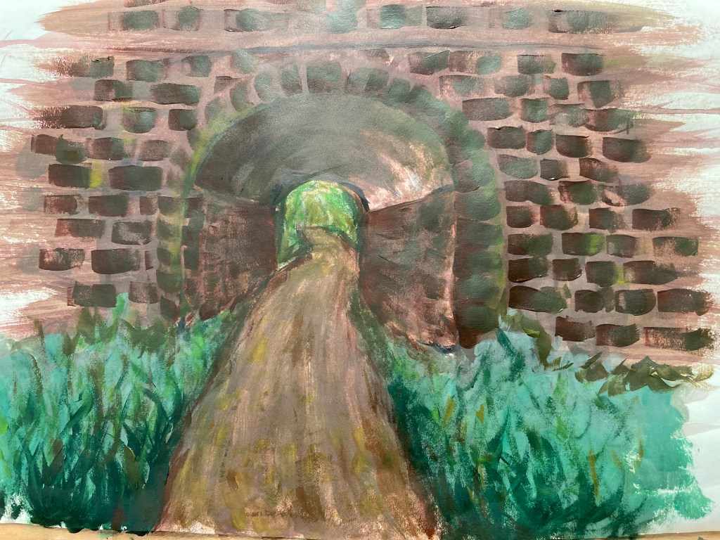 I then began building up my layers of colours and applying the brushstrokes in the direction the tunnel was moving to assist in creating the illusion of depth and the movement of the brickwork. I then created the suggestion of cobbles by laying the paint on with the brush thickly and in a sideways motion.