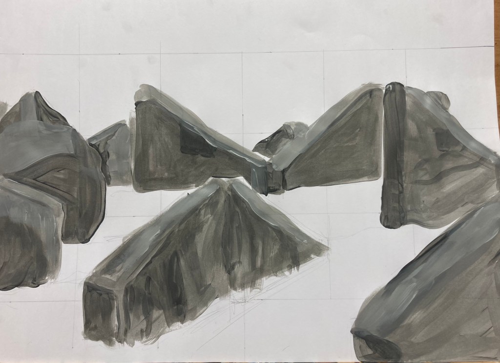 After creating my quick studies, I then moved on to my final piece, bearing in mind my tutor’s comments regarding not putting too much effort into the preparatory work to allow for an element of spontaneity within my final piece. As has become my custom, I slowly built this up layer by layer, from dark to light, then adding a few darker details in and then finishing with a lighter overlay where needed.